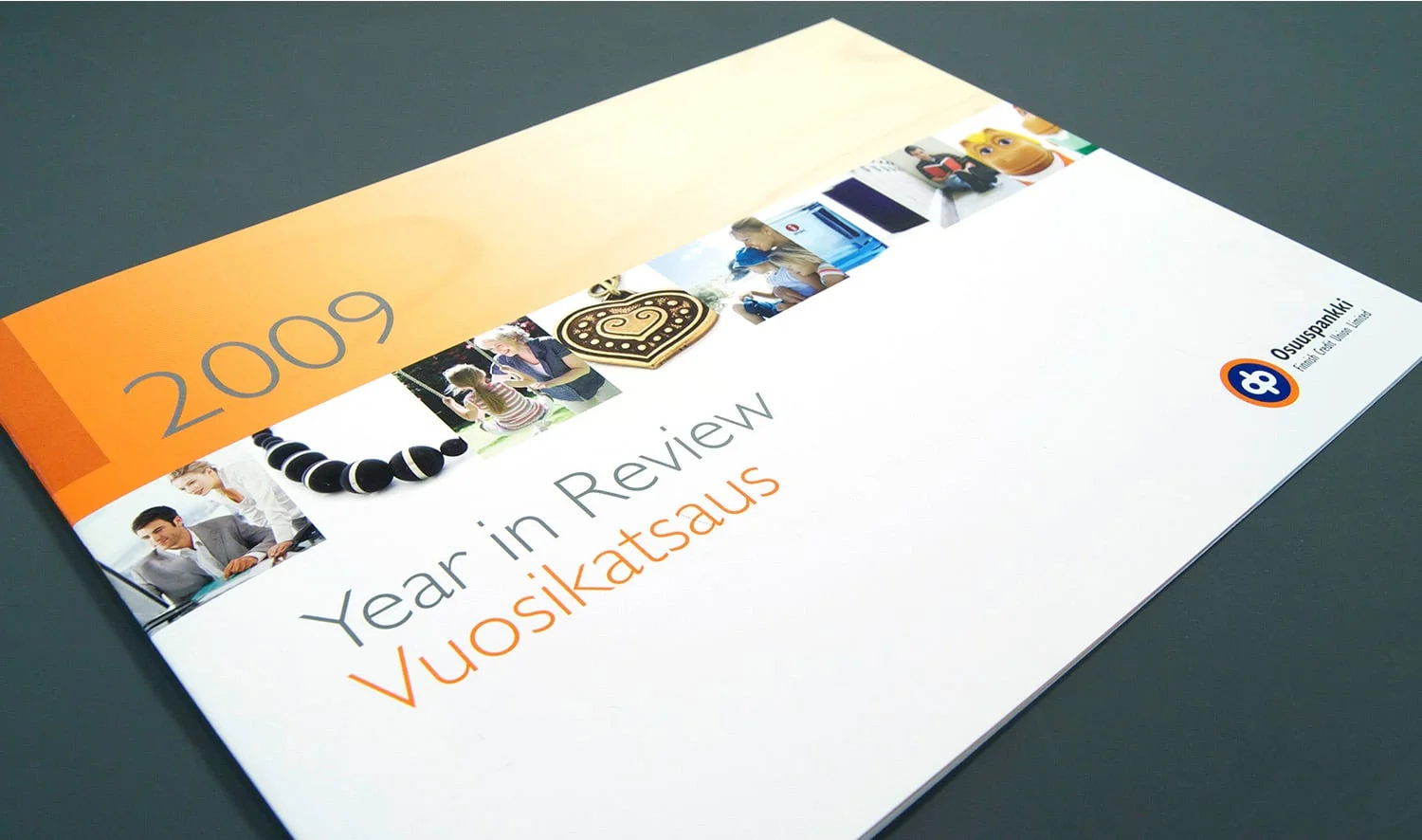 I have been designing and producing the Finnish Credit Union of Toronto's (Osuuspankki) "Year in Review" for since 2009 to this current year. It's a 16-20 page booklet giving an annual report style overview for the credit union's members. One of the challenges with the design is dealing with the bilingual sections set in two languages (Finnish and English).